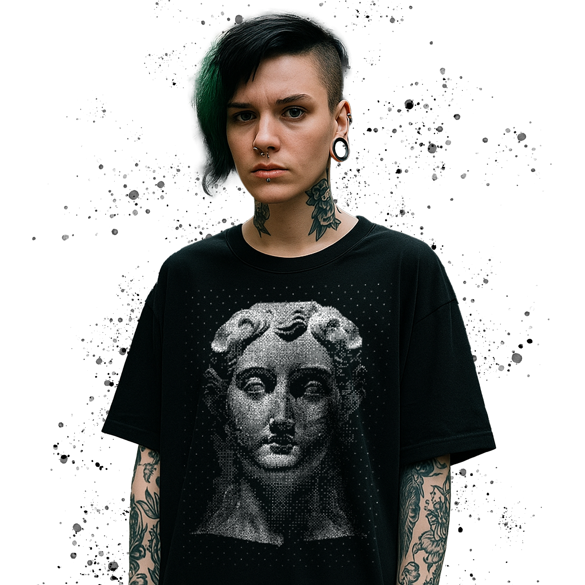 Klassische Schönheit mit digitalem Flair! Ein stilvolles Statement, das die Grenzen zwischen traditioneller Kunst und modernem Design verschwimmen lässt.